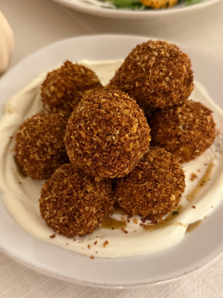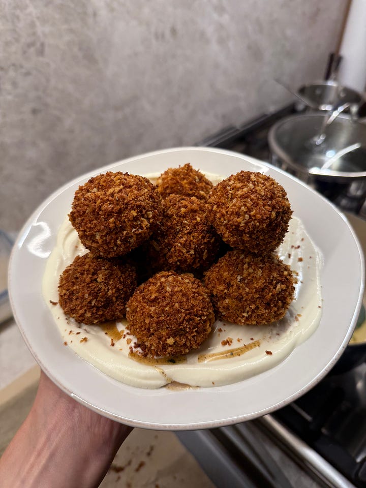 Crispy on the outside with some melted creamy mozzarella inside. To make these I mixed mashed roasted butternut squash with ricotta, Parmigiano, some sage, then placed a small piece of mozzarella in the center of each one. I rolled the croquettes in panko breadcrumbs (that I toasted lightly in a pan for some color and extra crunch), then baked them for 25 minutes at 420°F (215C) until golden.