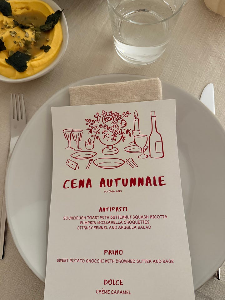 The theme for the dinner was a cozy Italian fall evening. I wanted it to feel warm and seasonal: full of comforting flavors like squash, sweet potato, browned butter, and sage.