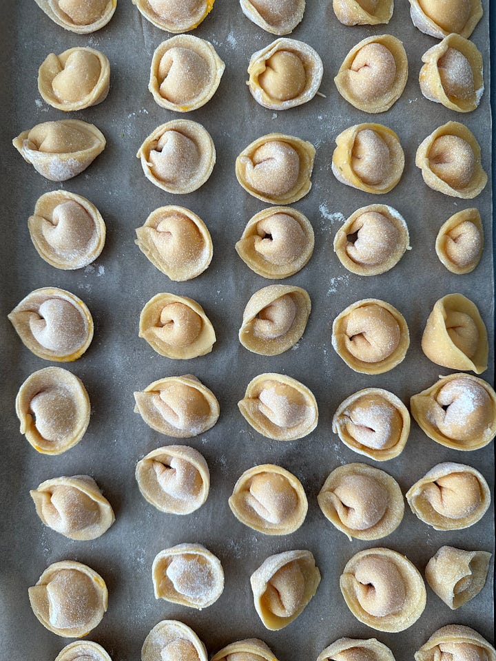 Divide the dough into 6 equal parts. Roll each piece using a pasta machine (or rolling pin) until thin and slightly translucent but not fragile. Place teaspoons of filling spaced apart on the sheet. Using a round cutter (or a glass), cut around each mound of filling, then fold each circle over to form a half-moon. Press edges to seal, then bring the two corners together and pinch to form the classic tortelli shape.