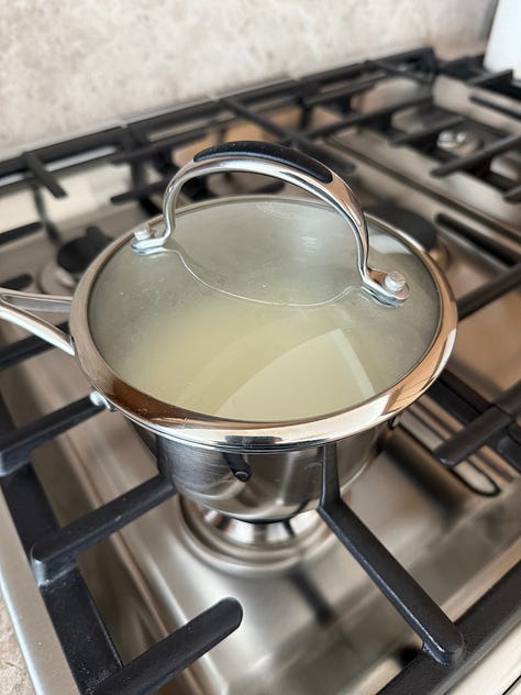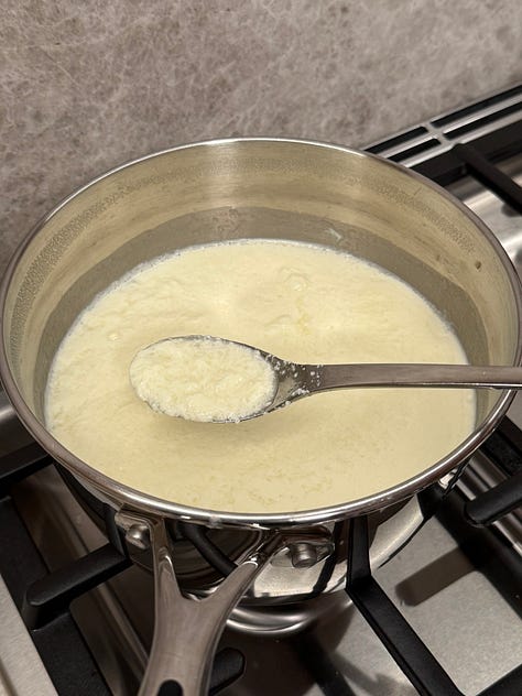 Remove from heat, add the lemon juice, and give it one slow stir. Let it sit undisturbed for 10 minutes with the pot lid on. The curds will separate from the whey.Drain