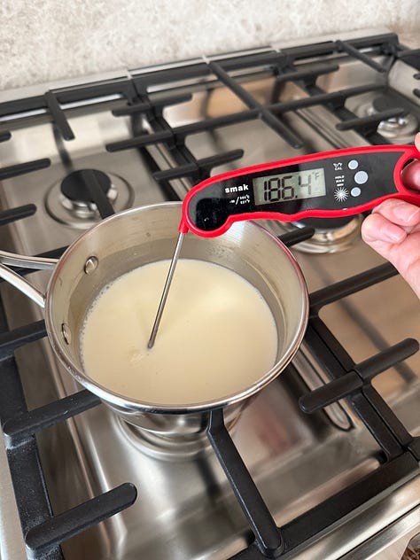 In a saucepan, combine the milk and cream and heat over medium until it reaches 88–90°C (190°F), just below a boil, when bubbles form around the edges. Add the salt and mix until the salt is dissolved (10 seconds).Add acid and let it curdle